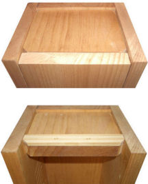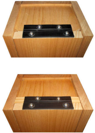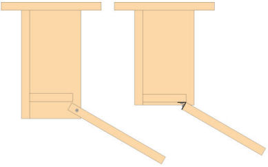 The poly hinge system allows us to build a nestbox with a bottom hinged door with only a 1/4" floor recess. Bottom pivoting doors with conventional screw pivots require a deeply recessed floor, usually 1 1/2", which provides a cozy niche attractive to paper wasps (see diagrams at left).