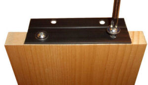 Place the hinge on the bottom of the door, align, and drill 1/8" pilot holes in the door. Fasten the hinge to the door using #8 x 1" lathe or truss head screws.