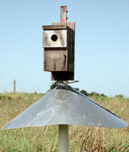 Conical baffles made of sheet metal will help deter squirrels, raccoons, cats and snakes. This type of baffle is useful if boxes are mounted on wooden posts and can be installed after a box is mounted. Raccoons may eventually learn their way around a conical baffle. Sharp edges require caution.