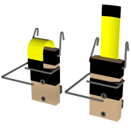 Installed inside box just below entry. Metal band made from piece of retractable tape measure is bent down to engage wire retaining arm. When bird enters nestbox it trips arm, releasing the band which closes over the entry hole. Trap works on both wood and pvc boxes.