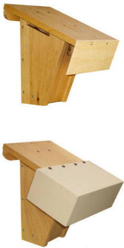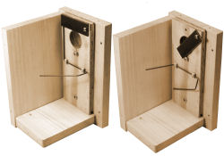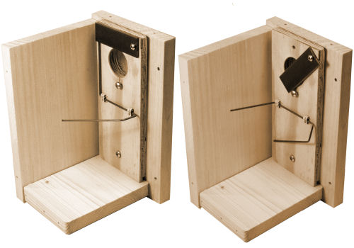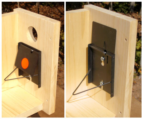 Installed inside box just below entry. To set, spring loaded top panel is engaged on the trigger arm. As bird enters the nestbox, it trips the arm, releasing the top panel which closes over the entry hole. When tripped, red dot on top panel shows through entry for distance visibility. Traps are available for both wood and pvc boxes from Van Ert Enterprises