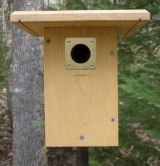 The object of a wren guard is to hide the entrance hole from the House Wren (HOWR). Wren guards can be constructed from wood, paperboard or cardboard and installed after the first egg is laid. Guards can be equipped with sides which add even more protection by making the entrance harder to see. Whatever the material or style, guards should cover the hole with enough space between the guard and the front of the box to allow entrance by the adults. Bluebirds appreciate a 3" space; chickadees can use a 2.5" space; brown headed nuthatches can access the hole if the guard is as close as 1-1.5" due to their habit of crawling around on the box. Wren guards must be removed prior to fledging.