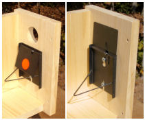 Installed on plywood panel which is then installed in nestbox as shown. To set, metal plate is swiveled up and held in place with arming rod. As bird enters the nestbox it trips the arm, releasing the metal plate to fall down over the entry.